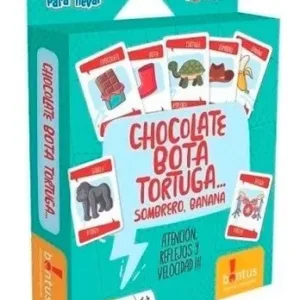 Atención, reflejos y velocidad! Se Mezclan y reparten todas las cartas, cara abajo, entre los jugadores. El primero da vuelta una de sus cartas, la ubica cara arriba en el centro de la mesa y dice “Chocolate”. El siguiente da vuelta una de sus cartas dice “Bota” y la ubica sobre la carta anterior haciendo una pila. El siguiente hace lo mismo y dice “Tortuga”; y así sigue la ronda hasta que… la carta que se juega coincide con la palabra dicha! Sombrero! En ese momento todos deben poner su mano sobre la pila de cartas, el último en hacerlo se lleva todas las cartas de la pila. Luego la ronda vuelve a comenzar. Chocolate, Bota, Tortuga, Sombrero, Banana, Chocolate… El primero en descartarse es el ganador del juego! Hay que mantener el ritmo, sin espiar y sin hacer amagues …y, si llega a salir una vaca… Muuuuuuu…cho cuidado!