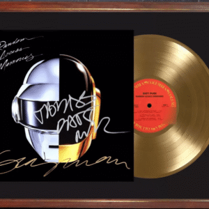 El display case está montado sobre un cuadro vidriado de 40×50 cm listo para colgar. Incluye la reproducción de una tapa del LP “Random Access Memories” autografiada por Guy-Manuel de Homem-Christo (n. 1974) y Thomas Bangalter, cuyo original fue subastado en USA, más un vinilo simil disco de oro. Todo presentado de un modo impecable sobre passpartout negro. IMPORTANTE: Se trata de unproducto decorativo, no sirve para reproducir.