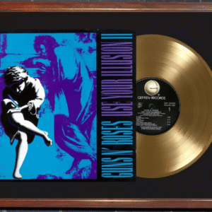 El display case está montado sobre un cuadro vidriado de 40×50 cm listo para colgar. Incluye la reproducción de una tapa del LP “Use your Illusion”, más un vinilo simil disco de oro. Todo presentado de un modo impecable sobre passpartout negro. ATENCION: Se trata de un producto decorativo, no sirve para reproducir.