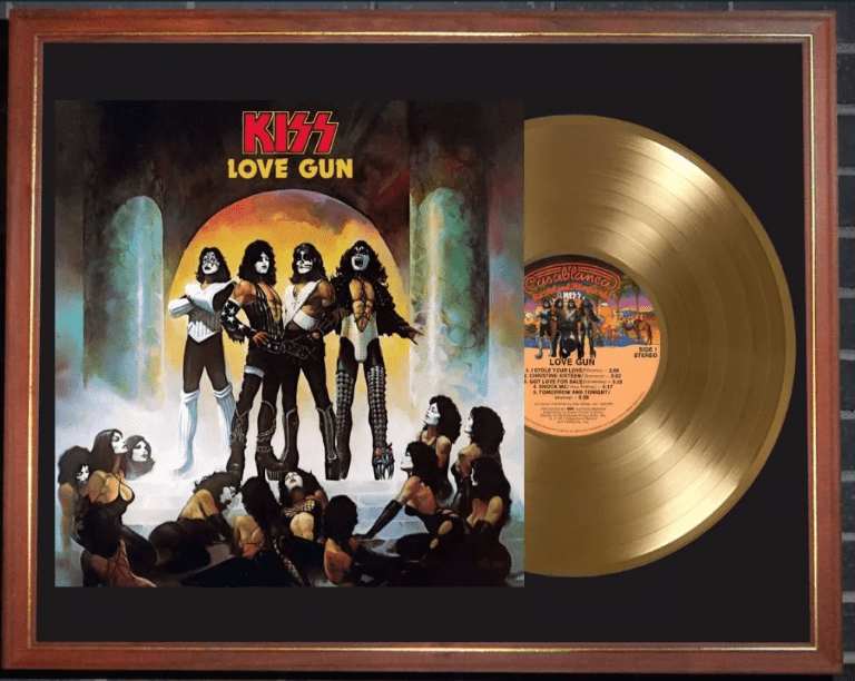 El display case está montado sobre un cuadro vidriado de 40×50 cm listo para colgar. Incluye la reproducción de la tapa del LP “Love Gun” más un vinilo simil disco de oro. Todo presentado de un modo impecable sobre passpartout negro.