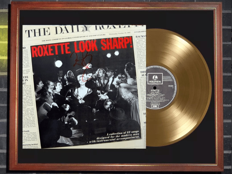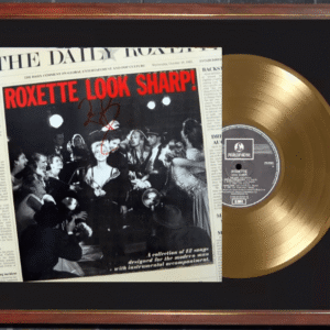El display case está montado sobre un cuadro vidriado de 40×50 cm listo para colgar. Incluye la reproducción de una tapa del LP “Look Sharp” autografiada por Perl Gessle, cuyo original fue subastado en USA, más un vinilo simil disco de oro. Todo presentado de un modo impecable sobre passpartout negro. IMPORTANTE: Se trata de un producto decorativo, no sirve para reproducir.