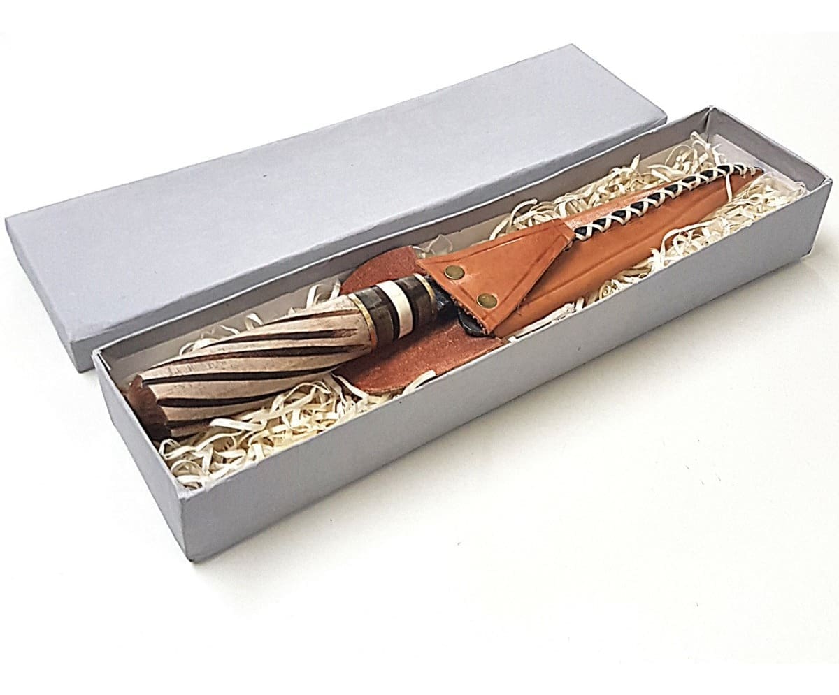 Incluye Vaina de cuero cocida a mano con hilo de campo.