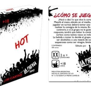 La Previa Hot es la versión mas picante. Es un juego para mayores de 18 años ideal para conocer más a tus amigos, conocidos, etc. Entra dentro de la categoría de juegos para la previa. Ideal para tomar algo, desinhibirte y entrar enconfianza con tus pares. Un juego ideal para llevar a reuniones ya que es super portatil y con 180 cartas! El doble en cantidad de otros juegos de previa. Duración de Partida: lo que quieras. Cantidad de Jugadores: 2 o más. Edad Recomendada: mayores de 18 años