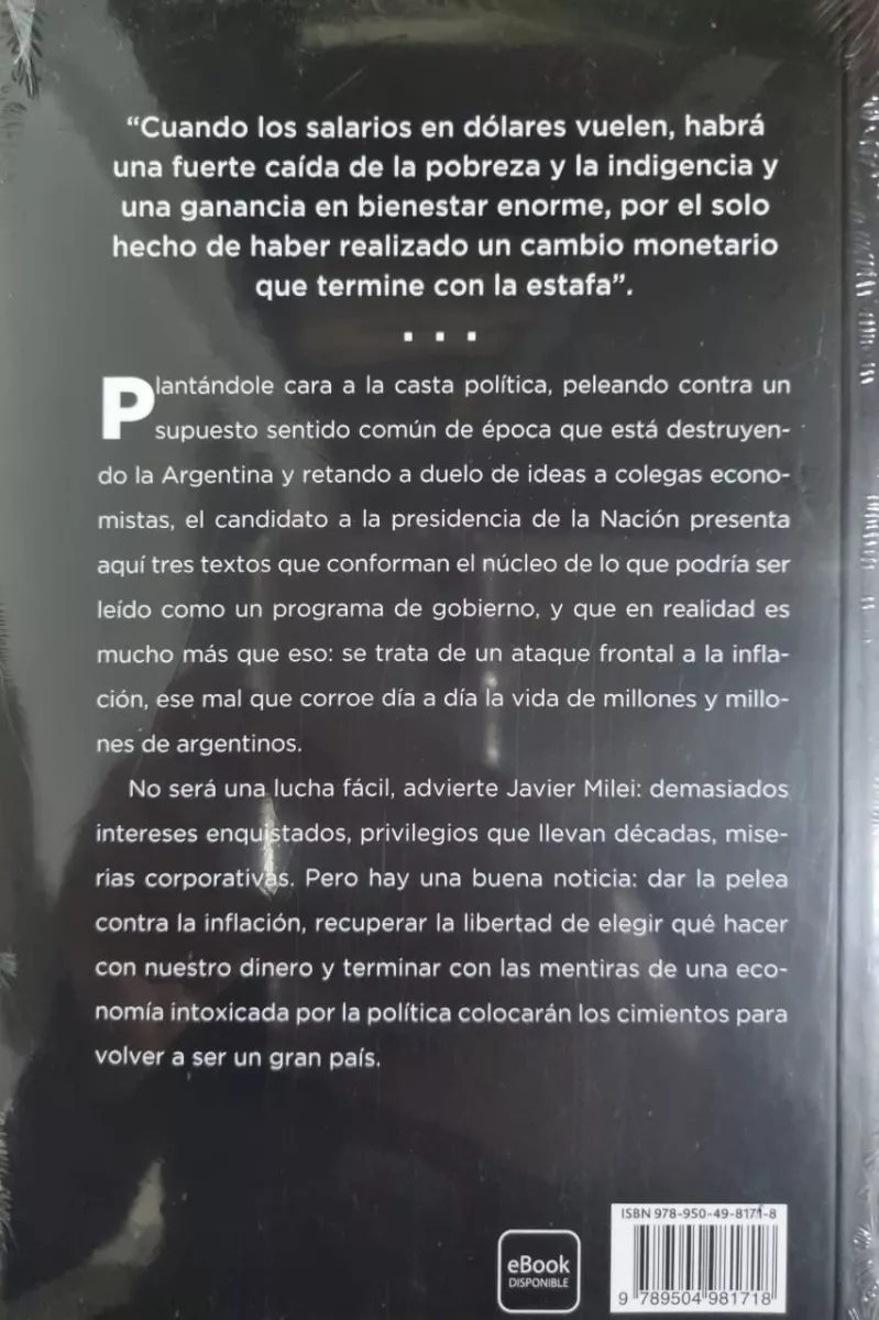 Plantándole cara a la casta política, peleando contra un supuesto sentido común de época que está destruyendo la Argentina y retando a duelo de ideas a colegas economistas, el candidato a la presidencia de la Nación presenta aquí tres textos que conforman el núcleo de lo que podría ser leído como un programa de gobierno, y que en realidad es mucho más que eso: se trata de un ataque frontal a la inflación, ese mal que corroe día a día la vida de millones y millones de argentinos.