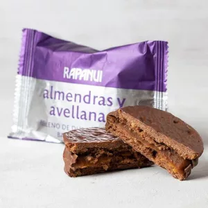 2 alfajores de almendras y avellanas rellenos de dulce de leche bañados con chocolate con leche