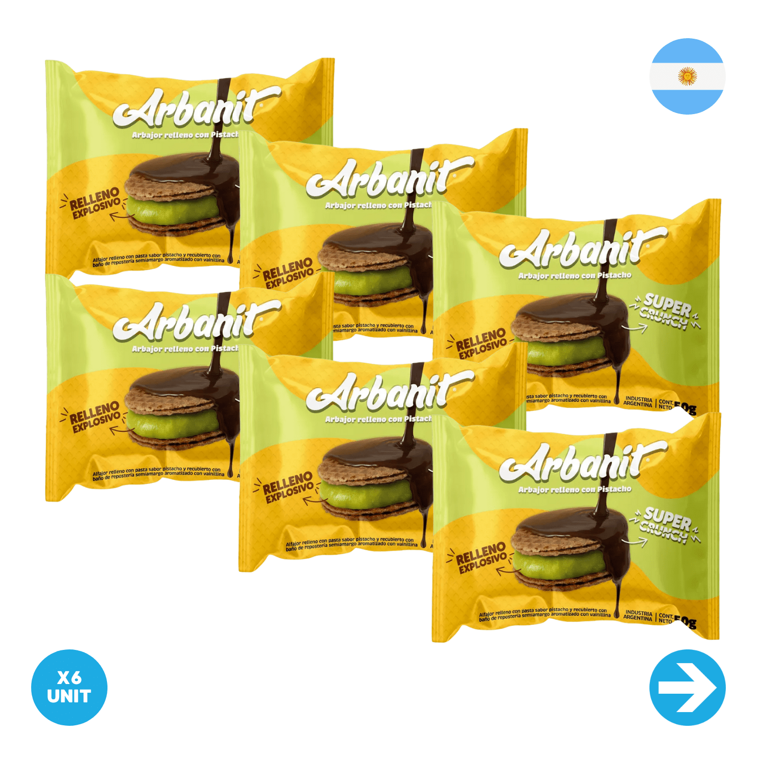 Disfrutá de un momento dulce con el Alfajor Arbanit relleno de pasta de pistacho. Su sabor único y textura suave hacen que cada bocado sea especial.
