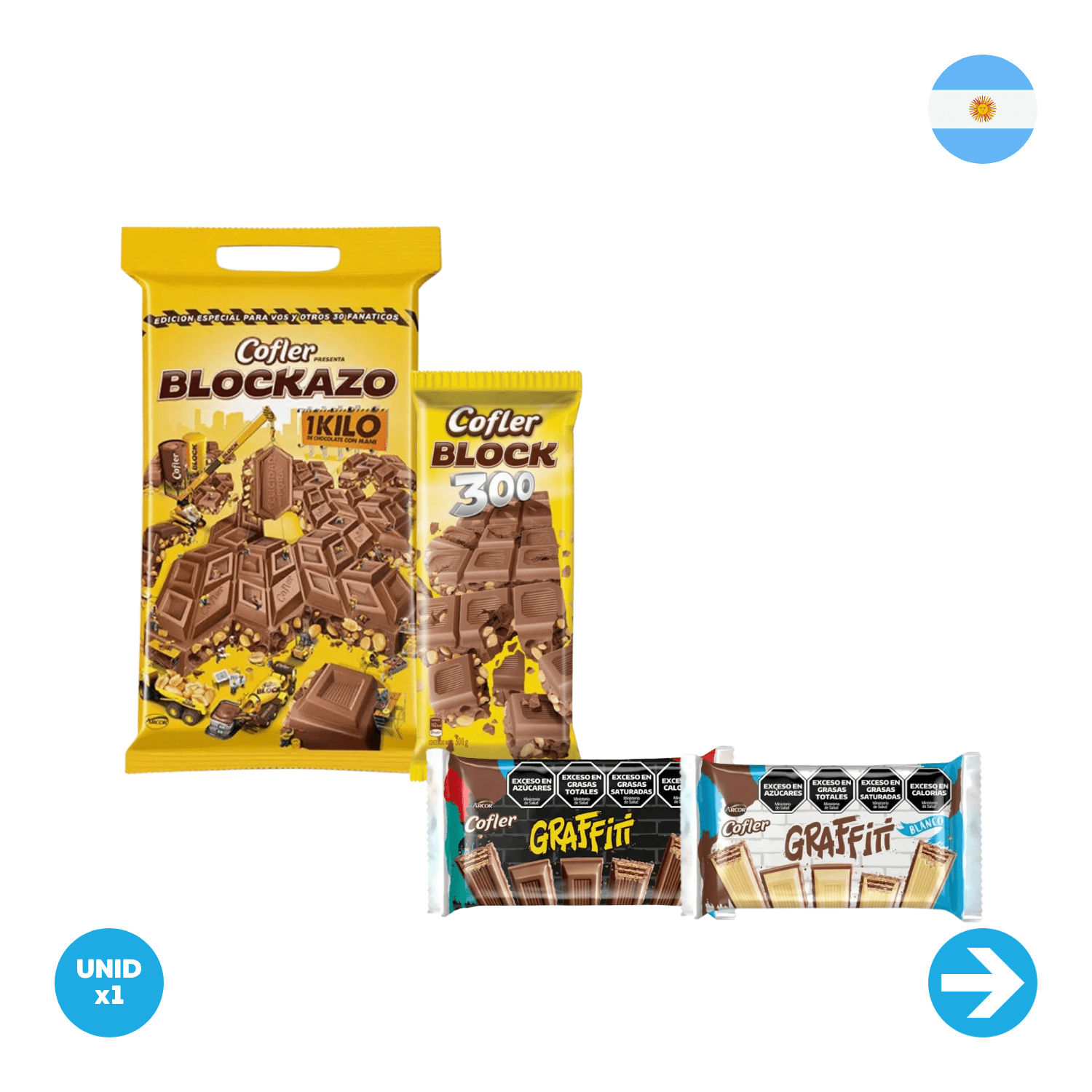 En este combo encontrarás una tableta de chocolate con leche y maní Cofler Block de 300 g, perfecta para satisfacer tus antojos más dulces. Además, también recibirás una barra de chocolate con maní Cofler Block de 1 kg, ideal para compartir con amigos y familiares.