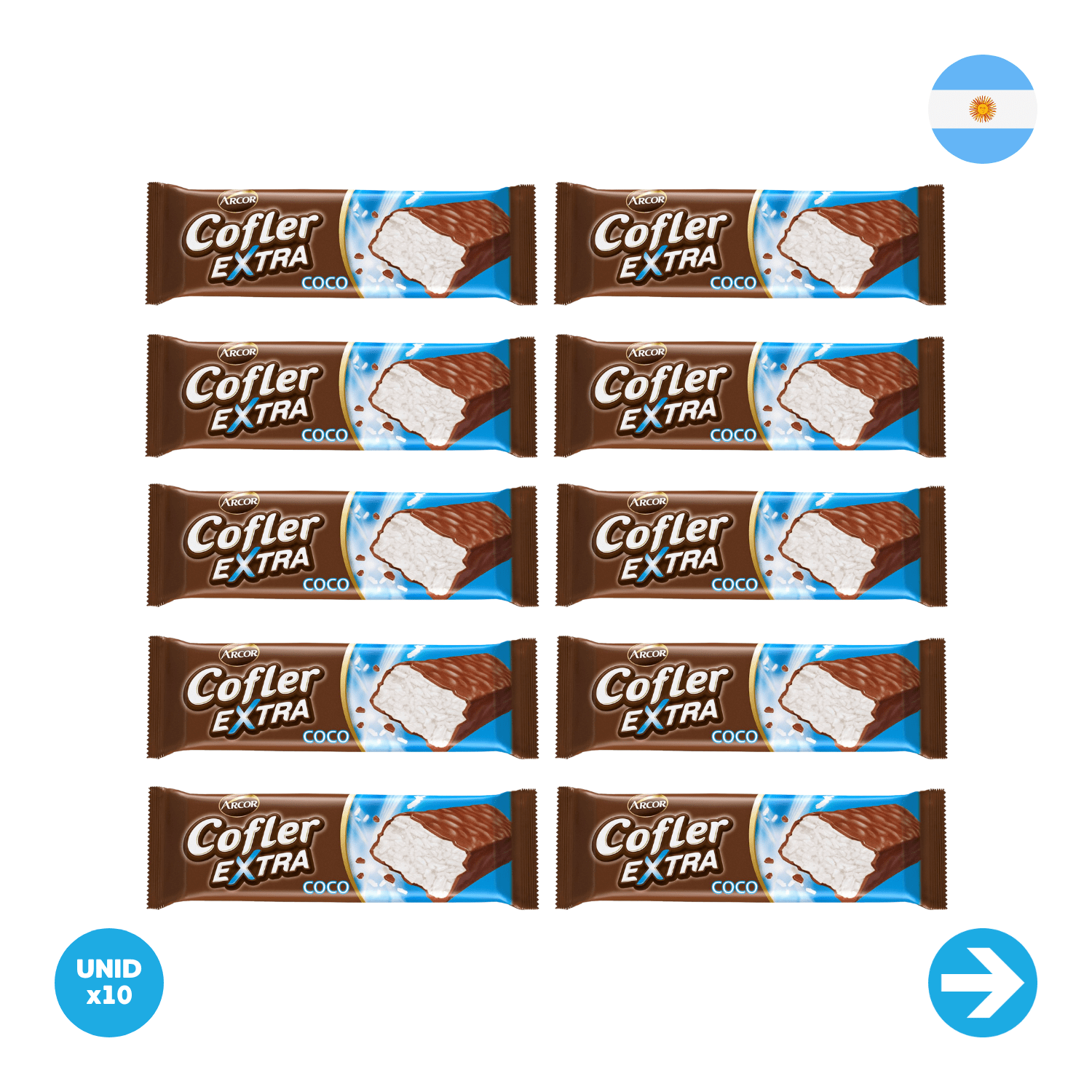 Cofler Oblea rellena sabor a coco con cobertura de chocolate.