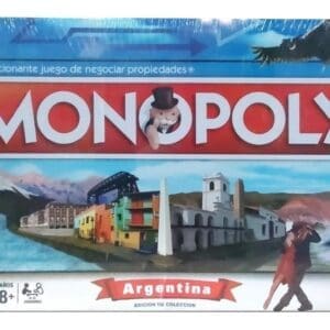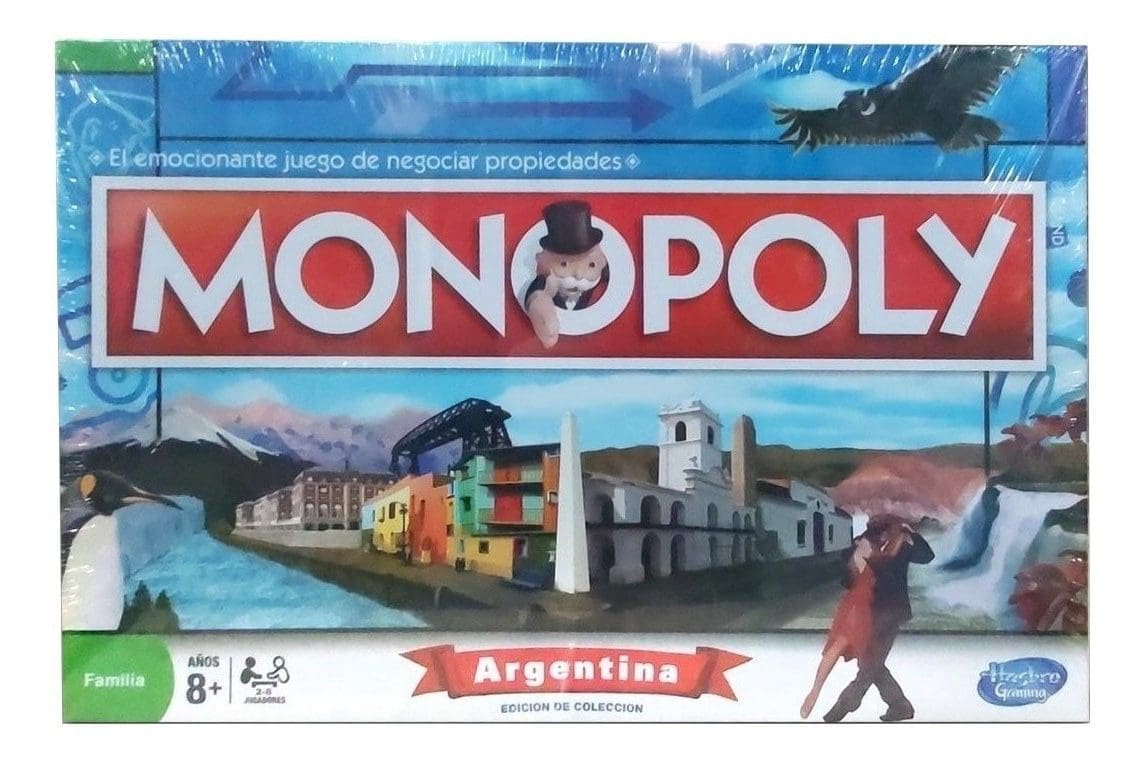 Monopoly Argentina. El emocionante juego de negociar propiedades. El objetivo de este juego es obtener grandes beneficios comprando, alquilando y vendiendo propiedades, de tal forma que uno de los jugadores llegue a ser el mas rico y por consiguiente el ganador. Monopoly ha sido producido bajo licencia en 43 paises y en 26 idiomas diferentes. Por muchos años ha alegrado los hogares de diversos paises del mundo con su original diseño y reglas. Es una gran satisfaccion presentar este tradicional juego especialmente diseñado con lugares calles y monumentos , que recrean geograficamente a la Republica Argentina. Incluye: 1 Tablero, 6 Peones de colores, 32 Casas, 12 Hoteles, 28 Cartas de Propiedades, 16 Cartas de Fortuna, 16 Cartas Arca Comunal, 2 Dados, Dinero de Fantasia e Instrucciones. Cantidad de jugadores: de 2 a 6.