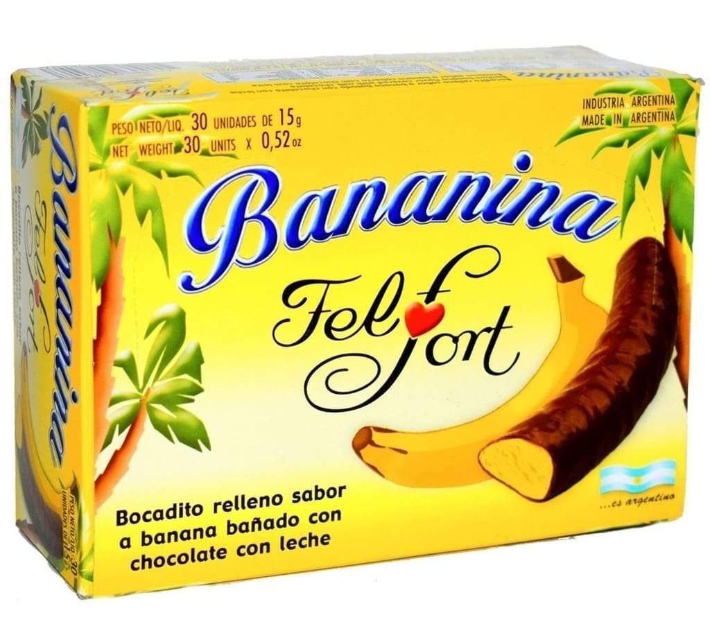 Bocadito relleno sabor a banana cubierto con chocolate.