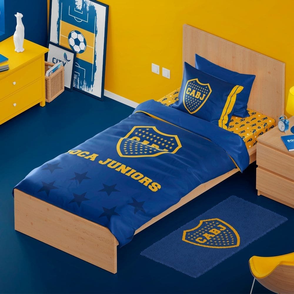 Twin 1.5p single bed sheet set, with blue and yellow colors plus Boca Jrs shield.