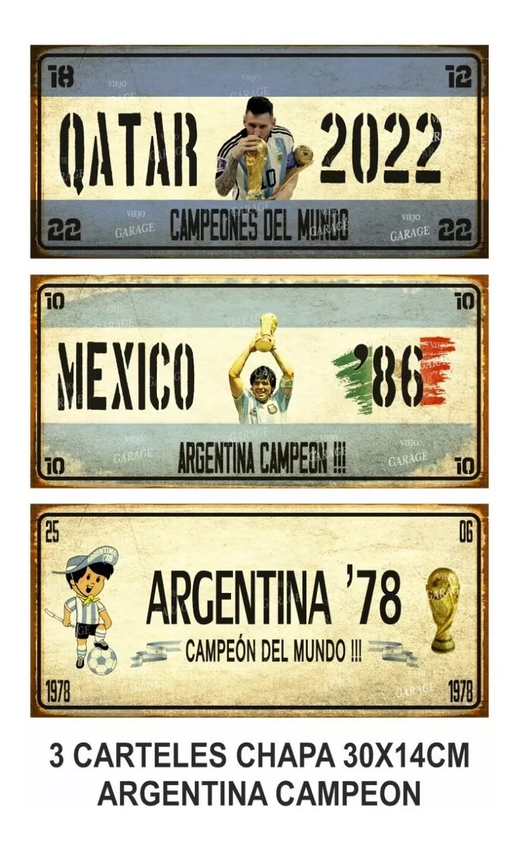 La Publicación incluye 3 Chapas Decorativa Vintage Retro tamaño 30x14cm de los modelos publicados Argentina Campeones del Mundo