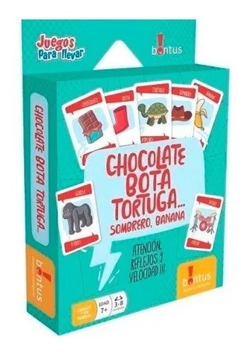 Atención, reflejos y velocidad! Se Mezclan y reparten todas las cartas, cara abajo, entre los jugadores. El primero da vuelta una de sus cartas, la ubica cara arriba en el centro de la mesa y dice “Chocolate”. El siguiente da vuelta una de sus cartas dice “Bota” y la ubica sobre la carta anterior haciendo una pila. El siguiente hace lo mismo y dice “Tortuga”; y así sigue la ronda hasta que… la carta que se juega coincide con la palabra dicha! Sombrero! En ese momento todos deben poner su mano sobre la pila de cartas, el último en hacerlo se lleva todas las cartas de la pila. Luego la ronda vuelve a comenzar. Chocolate, Bota, Tortuga, Sombrero, Banana, Chocolate… El primero en descartarse es el ganador del juego! Hay que mantener el ritmo, sin espiar y sin hacer amagues …y, si llega a salir una vaca… Muuuuuuu…cho cuidado!