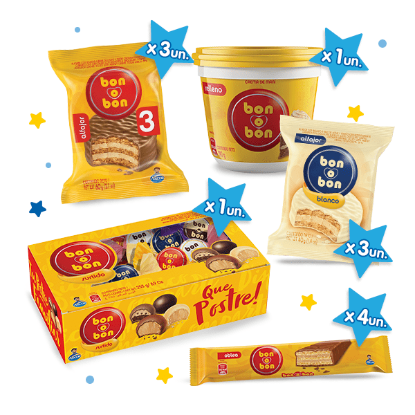 1 Caja Bon o Bon surtido 255 gr + Oblea Bon o Bon leche 30 grs pack x4 unidades + Alfajor Bon o Bon Triple 60gr pack x3 unidades + Alfajor Bon o Bon Blanco 40gr pack x3 unidades + 1 Relleno Bon o Bon 290 gr.