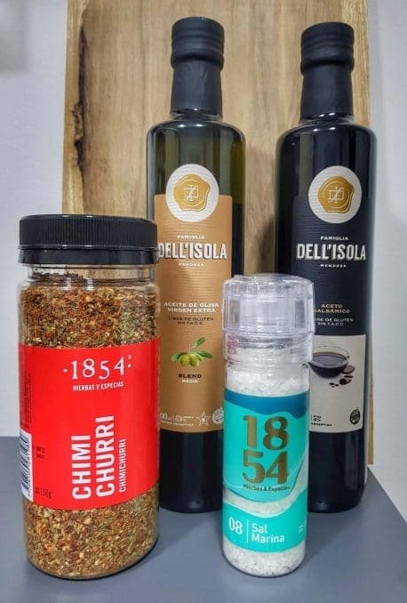 Este combo es ideal para condimentar todo tipo de carnes y ensaladas, trae un aceite de oliva extra virgen (medio), un aceto balsamico, un pote de chimichurri y un molinillo premium de sal marina.