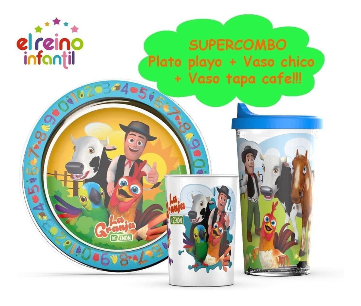 LLEVATE UN SET DE PLATO PLAYO MAS UN VASO CON TAPA CAFE MAS UN VASO CHICO PARA QUE LA HORA DE LA COMIDA SEA MAS DIVERTIDA JUNTO A TUS PERSONAJES FAVORITOS DE LA GRANJA.