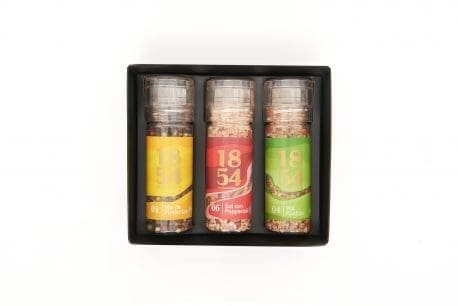 Contains 3 grinders. Mix of Pepper Grinder. Rustic Flavors Grinder. Pepperoni Salt Grinder