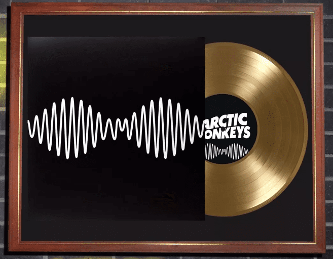El display case está montado sobre un cuadro vidriado de 40×50 cm listo para colgar. Incluye la reproducción de una tapa del LP “AM”, más un vinilo simil disco de oro. Todo presentado de un modo impecable sobre passpartout negro. IMPORTANTE: Se trata de un producto decorativo que NO sirve para reproducir.