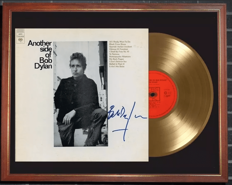 El display case está montado sobre un cuadro vidriado de 40×50 cm listo para colgar. Incluye la reproducción de una tapa del LP “Another Side of Bob Dylan” de 1964 autografiada por Dylan, cuyo original fue subastado en USA, más un vinilo símil disco de oro. Todo presentado de un modo impecable sobre passpartout negro.