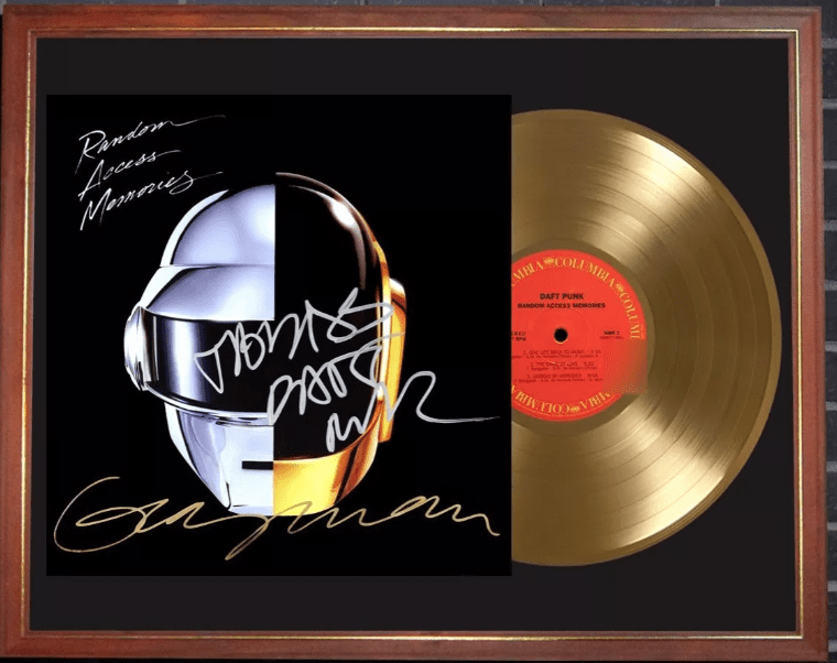 El display case está montado sobre un cuadro vidriado de 40×50 cm listo para colgar. Incluye la reproducción de una tapa del LP “Random Access Memories” autografiada por Guy-Manuel de Homem-Christo (n. 1974) y Thomas Bangalter, cuyo original fue subastado en USA, más un vinilo simil disco de oro. Todo presentado de un modo impecable sobre passpartout negro. IMPORTANTE: Se trata de unproducto decorativo, no sirve para reproducir.