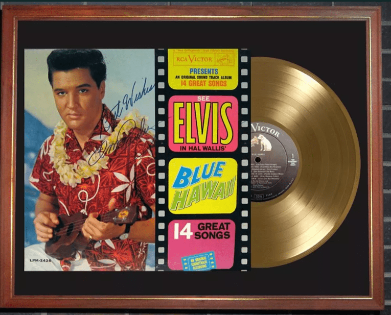El display case está montado sobre un cuadro vidriado de 40×50 cm listo para colgar. Incluye la reproducción de una tapa del LP “Blue Hawaii” autografiada por Elvis, cuyo original fue subastado en USA, más un vinilo simil disco de oro. Todo presentado de un modo impecable sobre passpartout negro. IMPORTANTE: Se trata de un producto decorativo, NO sirve para reproducir.