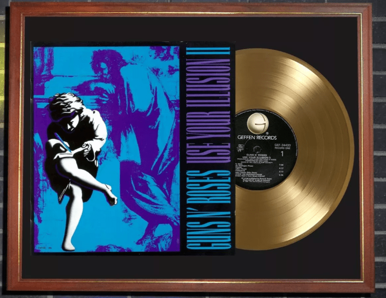 El display case está montado sobre un cuadro vidriado de 40×50 cm listo para colgar. Incluye la reproducción de una tapa del LP “Use your Illusion”, más un vinilo simil disco de oro. Todo presentado de un modo impecable sobre passpartout negro. ATENCION: Se trata de un producto decorativo, no sirve para reproducir.