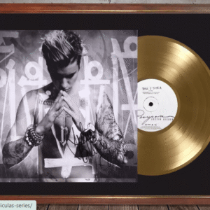 El display case está montado sobre un cuadro vidriado de 40×50 cm listo para colgar. Incluye la reproducción de una tapa del LP “Purpose” autografiada por Justin, cuyo original fue subastado en USA, más un vinilo simil disco de oro. Todo presentado de un modo impecable sobre passpartout negro. IMPORTANTE: SE TRATA DE UN PRODUCTO DECORATIVO, NO SIRVE PARA REPRODUCIR.