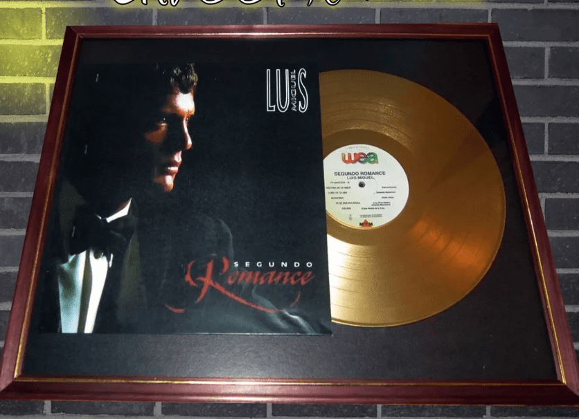El display case está montado sobre un cuadro vidriado de 40×50 cm listo para colgar. Incluye la reproducción de una tapa del LP Segundo Romance más un vinilo simil disco de oro. Todo presentado de un modo impecable sobre passpartout negro. IMPORTANTE: Se trata de un producto decorativo, que no sirve para reproducir.