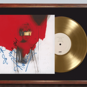 El display case está montado sobre un cuadro vidriado de 43×53 cm listo para colgar. Incluye la reproducción de una tapa del LP “Anti” firmada por Rihanna, cuyo original fue subastado en USA, más un vinilo simil disco de oro. Todo presentado de un modo impecable sobre passpartout negro. IMPORTANTE: SE TRATA DE UN PRODUCTO DECORATIVO, NO SIRVE PARA REPRODUCIR.