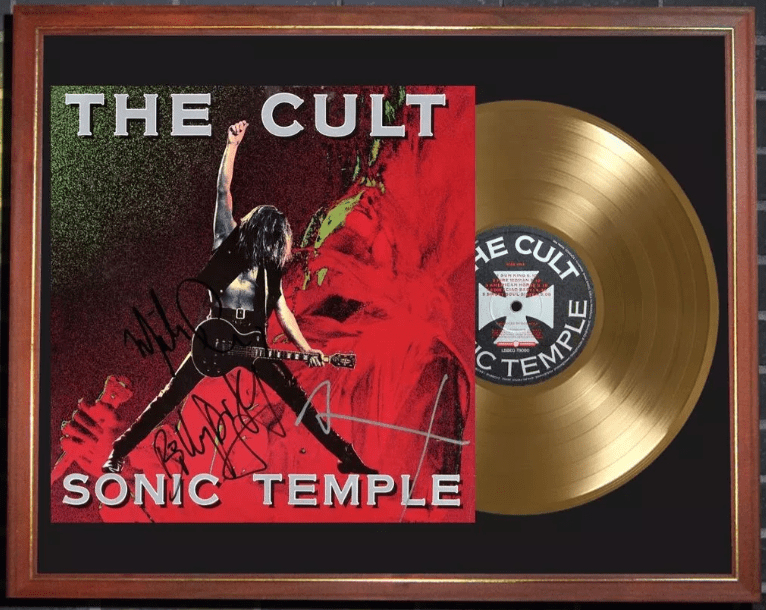 El display case está montado sobre un cuadro vidriado de 40×50 cm listo para colgar. Incluye la reproducción de una tapa del LP “Sonic Temple” autografiada por los Miembros de la banda, cuyo original fue subastado en USA, más un vinilo simil disco de oro. Todo presentado de un modo impecable sobre passpartout negro.