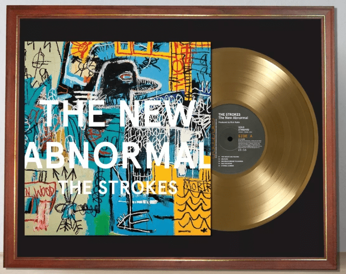 El display case está montado sobre un cuadro vidriado de 43,5×53,5 cm listo para colgar. Incluye la reproducción de una tapa del LP “The New Abnormal” más un vinilo simil disco de oro. Todo presentado de un modo impecable sobre passpartout negro. IMPORTANTE: Se trata de un producto decorativo que NO sirve para reproducir.