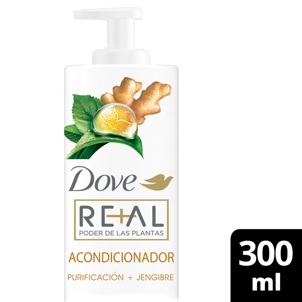 Acondicionador Dove REAL Poder de las Plantas Purificación + Jengibre; 1° línea natural a base de plantas. Los acondicionadores Dove hidratan el cabello dejándolo liviano, brillante y visiblemente revitalizado Acondicionador a base de plantas contiene hasta 98% de ingredientes naturales. Certificado por PETA: no testeado en animales. El Acondicionador Dove Real Poder de las Plantas posee una fragancia 100% de origen natural.