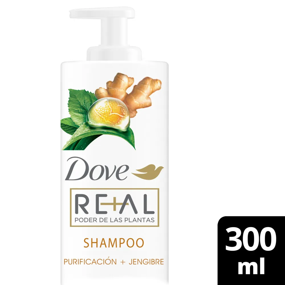 Shampoo Dove REAL Poder de las Plantas PURIFICACIÓN + JENGIBRE: Hidrata el cabello dejándolo liviano, brillante y visiblemente revitalizado. Su fórmula a base de plantas contiene hasta 95% de ingredientes de origen natural. Certificado por PETA: no testeado en animales. Dove REAL Poder de las Plantas Purificación + Jengibre no es un shampoo más. Es la 1° línea natural a base de plantas sin siliconas, sulfatos, parabenos ni colorantes. Posee una fragancia 100% de origen natural para brindarte todo el aroma y naturalidad del jengibre a tu cabello. Dove PURIFICACIÓN + JENGIBRE actúa sobre el pelo mixto, dejando tu pelo hidratado y brillante.