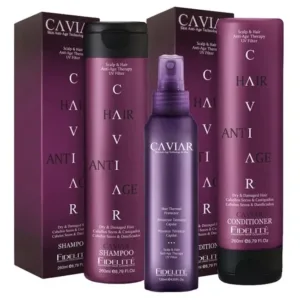 SHAMPOO Y ACONDICIONADOR PARA CABELLOS SECOS Y CASTIGADOS CAVIAR – FIDELITE x260 mL + PROTECTOR TERMICO CAVIAR.