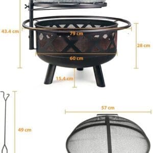 Fogata multifuncional para exteriores: diseñada tanto para cocinar un rico asado como para quemar leña. La placa de cocción está diseñada para girar 360 grados, que también se puede ajustar hacia arriba y hacia abajo para alcanzar la altura deseada.