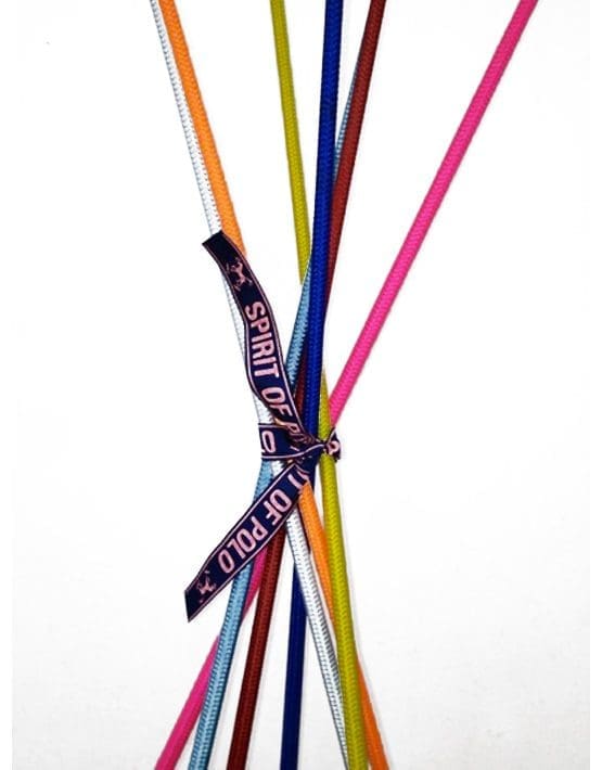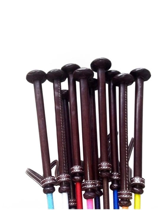 Estos látigos miden 110 cm. Compuestos por nylon y un mango de cuero. Amplia gama de colores disponibles.