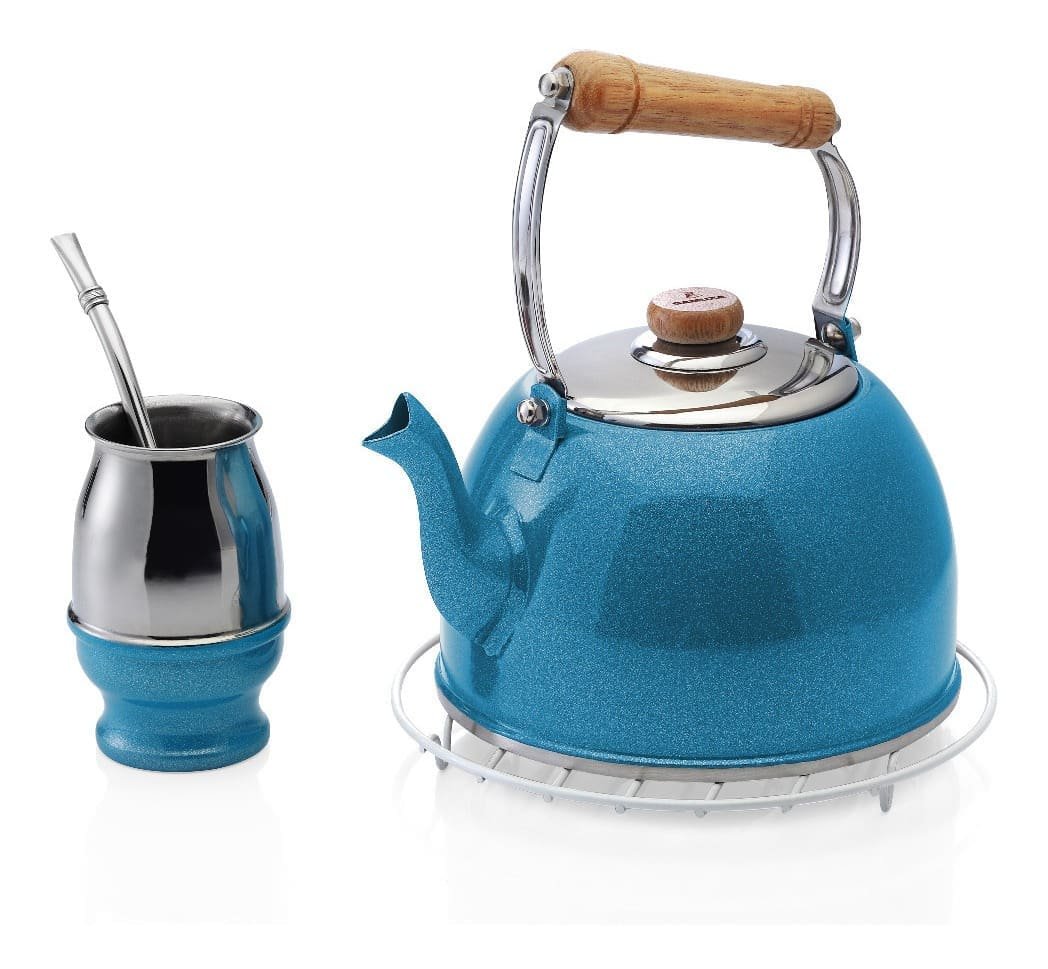 > Acero inoxidable 18/10 > Color exterior > Pulido interior > Pava con mango de madera > Mate térmico > Bombilla > Posapava de Acero