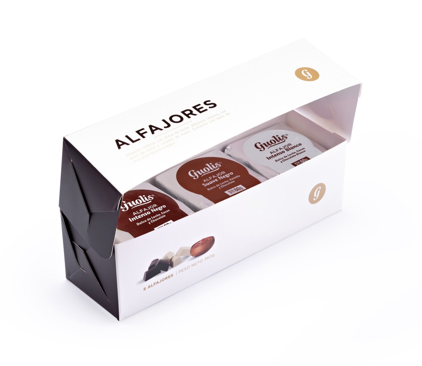 Mix of our alfajores filled with dulce de leche, with vanilla and cocoa dough, dipped in white Chocolate and semi-bitter Chocolate.