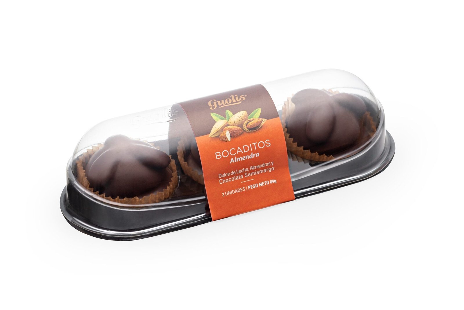 Bocaditos en blister de 3 unidades, rellenos de dulce de leche y 3 almendras bañados en chocolate semiamargo.