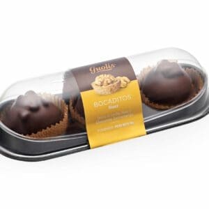 Bocaditos en blister de 3 unidades, rellenos de dulce de leche y nuez bañados en chocolate semiamargo.