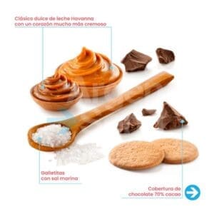 Cubierto con el famoso chocolate 70% cacao, relleno con nuestro clásico dulce de leche Havanna y un corazón mucho más cremoso, con tapas con cristales de sal marina para llenarte de mar y dulzura en cada mordisco.