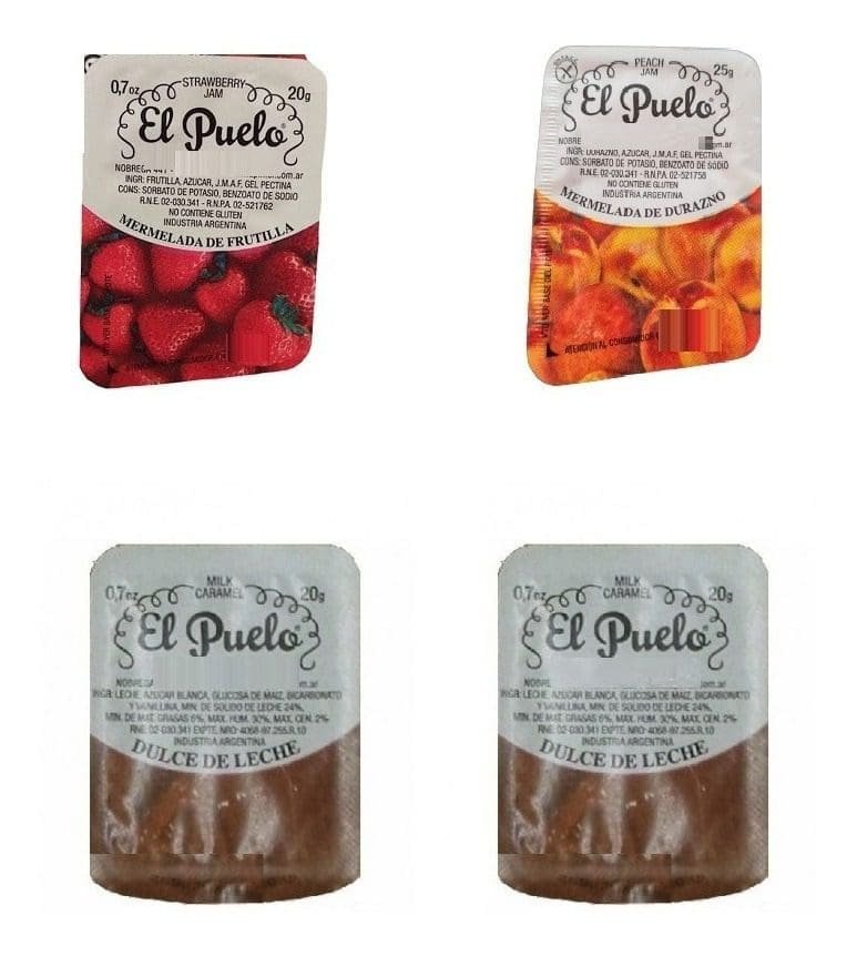 Dulce de leche individual of 20gs for 20 units + Jam individual of 20gs for 20 units in total (several flavors: strawberry – quince – apple – peach – apricot – plum)