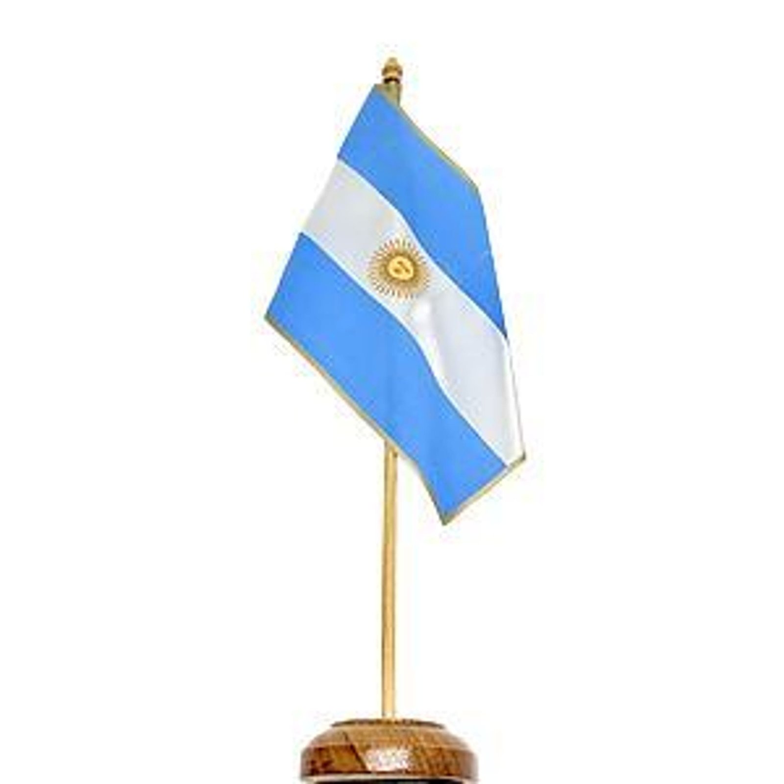Bandera Argentina de escritorio de 15x25cm en tela tafeta con base y mástil de madera torneada y barnizada. Altura 40cm.