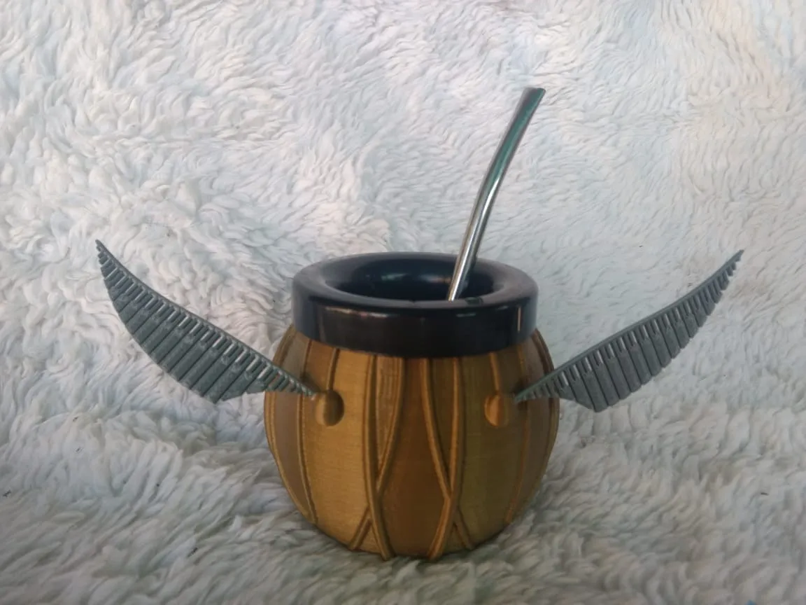 Mate de la Snitch de Harry Potter hecho en PLA con impresora 3D. Contiene un mate de polimero que se puede sacar para lavar e incluye la bombilla plástica con aro limpiafacil.