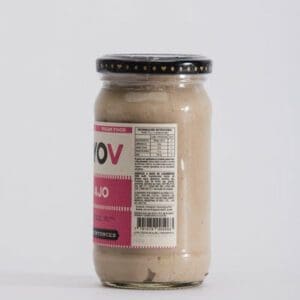 Mayonesa suave vegana elaborada con legumbres, aceite de girasol, un poquito se sal y jugo de limón. Sin huevo, sin leche, 100% vegana y sana. Con ajo.