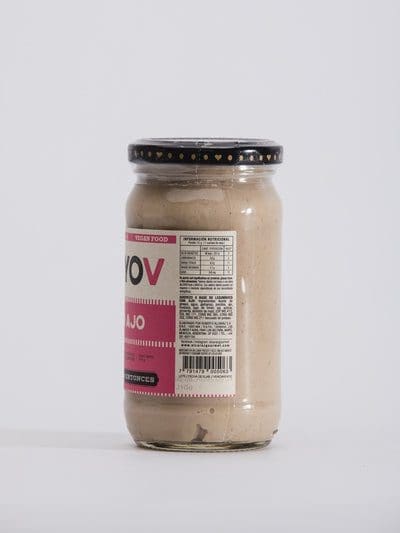 Soft vegan mayonnaise made with legumes, sunflower oil, a little salt and lemon juice. Egg free, dairy free, 100% vegan and healthy. With garlic.