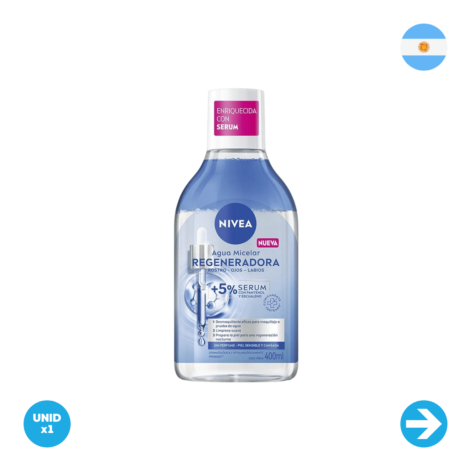 El Agua Micelar Nivea Regeneradora está enriquecida con Complejo de Aminoácidos y Suero al 5% con Pantenol y Escualano. Restaura la humedad y se regenera para una piel descansada a la mañana siguiente. Es un desmaquillante eficaz para el maquillaje.