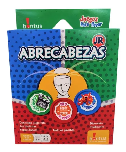 En equipo o individualmente, Abrecabezas Jr. es pura diversión para compartir con amigos y en familia, a la vez que descubren y ejercitan sus distintas capacidades! Golpéate el pecho como si fueras King Kong; modela un delfín, dí la palabra “Corazón” al revés; o silba/ tararea “la cucaracha”, siempre intentando que los demás reconozcan tu obra! 2 niveles de juego. 336 actividades! Un mazo de 56 cartas con 336 actividades, para grandes y niños. 1 paquete de masa para modelar de 70 gr. Una bolsita con cierre para guardar la masa. 48 fichas de puntos e instrucciones de juego.