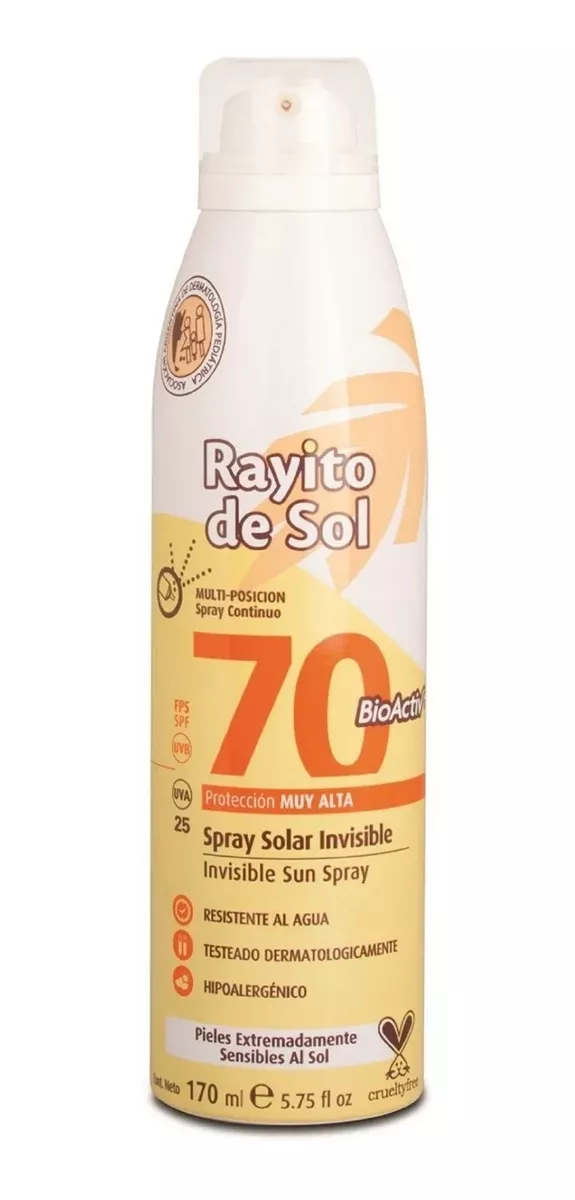 Un solo toque es suficiente para aplicar el nuevo Protector Solar Rayito de Sol en forma rápida y pareja. Su textura no oleosa seca rápidamente y no deja sensación grasosa protege la piel de los nocivos efectos de la radiación solar. Protege la piel de los perjudiciales efectos de la radiación solar. Su práctica presentación permite una aplicación pareja y rápida, facilitando la auto aplicación en zonas de difícil acceso como la espalda. No mancha, absorbe rápidamente. Apto para todo tipo de piel, especialmente las más sensibles. Hipo alergénico, Dermatológicamente Testeado, Oíl Free, Sin Parabenos, Proteccion de amplio espectro, resistentes al agua, textura ultra liviana, Aprobado por la Asociación Argentina de Dermatología Pediátrica.