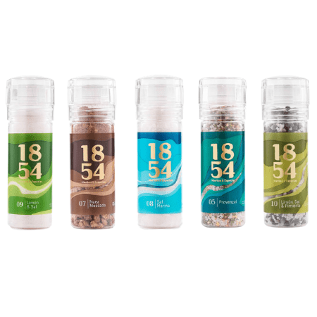 Incluye: 1 Molinillo Premium Limón Sal y Pimienta, 1 Molinillo Premium Sabor Provenzal, 1 Molinillo Premium Sal Marina, 1 Molinillo Premium Limón y Sal y 1 Molinillo Premium Nuez Moscada.